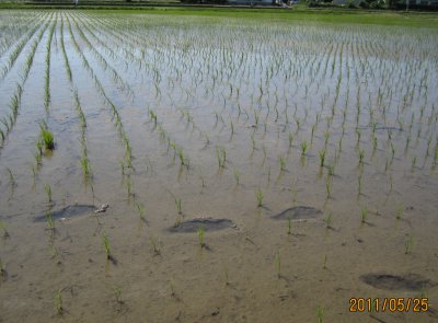 特別栽培米こがねもちの田植えより11日後の稲の様子です。