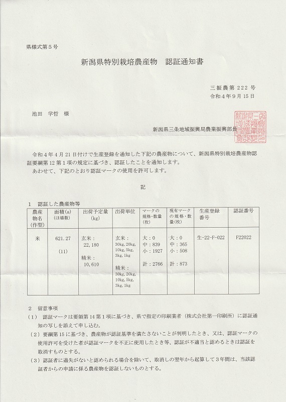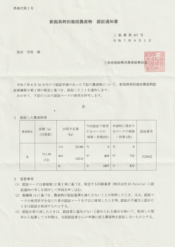 令和7年産も我が家のコシヒカリ・こがねもちが認証されました。